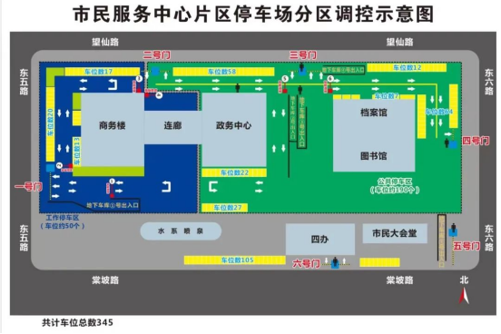 长沙县机关事务中心实地调研发现,到县政务中心办事群众多、车流量大,县政务中心仅有240个车位,远远不能满足需求,且工作人员与办事群众共用,时常造成拥堵。为有效解决办事群众停车难题,长沙县机关事务中心决定对该片区的停车管理实施高峰期分区管控,将地面停车场划分为公共停车区和工作停车区,公共停车区预留政务中心南北面及图书馆、档案馆周边地面停车位,共计约190个,专用于市民办事车辆临时停放,提高停车位利用率;工作停车区预留商务写字楼、连廊会议室周边地面停车位,共计约50个,用于保障会议、重要接待及公务停车。同时,为实现两大停车区单独管控,新增车辆道闸管理,实现办事、办公车辆停放分流,解决工作日早高峰期停车难问题。